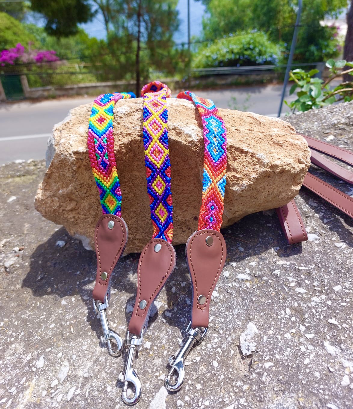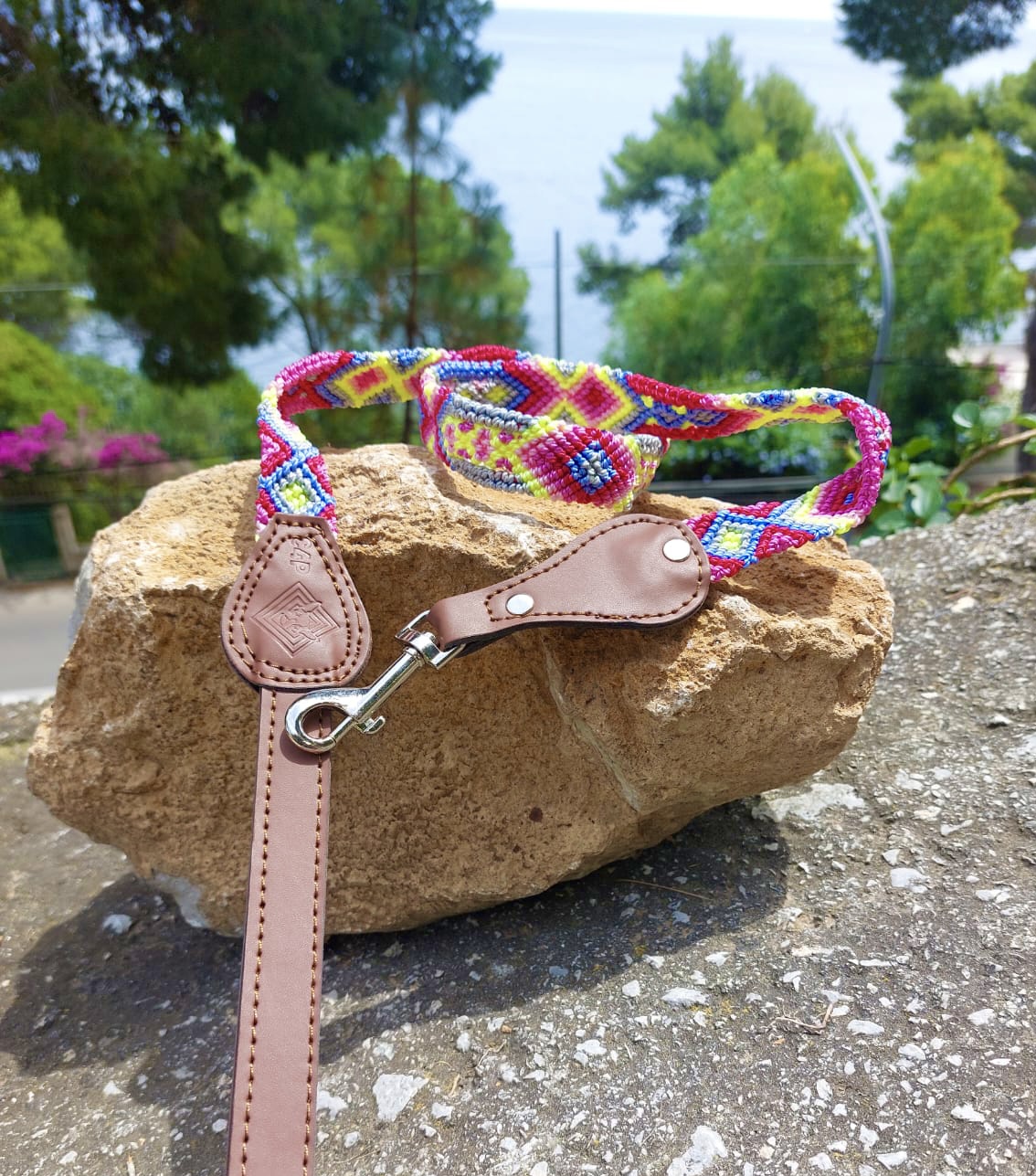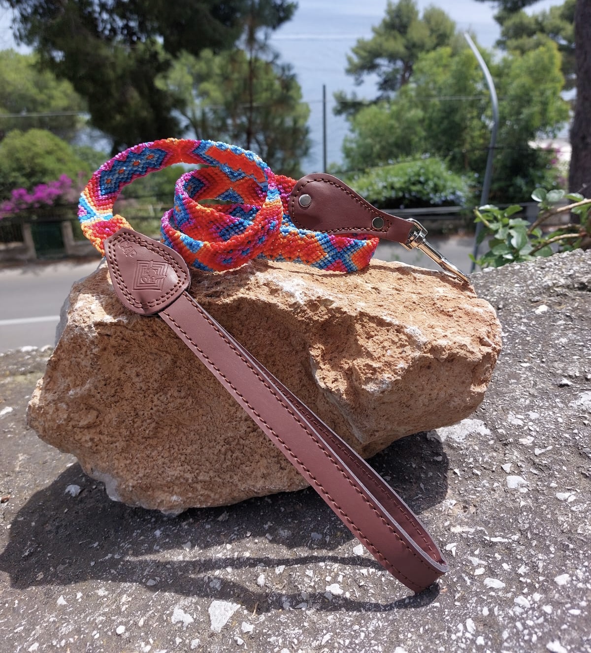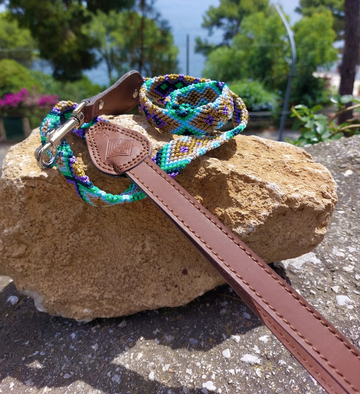Guinzaglio C4P, fatto con 5 colori di fili di cotone intrecciati a mano da artigiani dell’altipiano del Chiapas in Messico. Ampia manopola in ecopelle, 100% Cruelty free. Lunghezza 120 cm , larghezza 2,5cm.