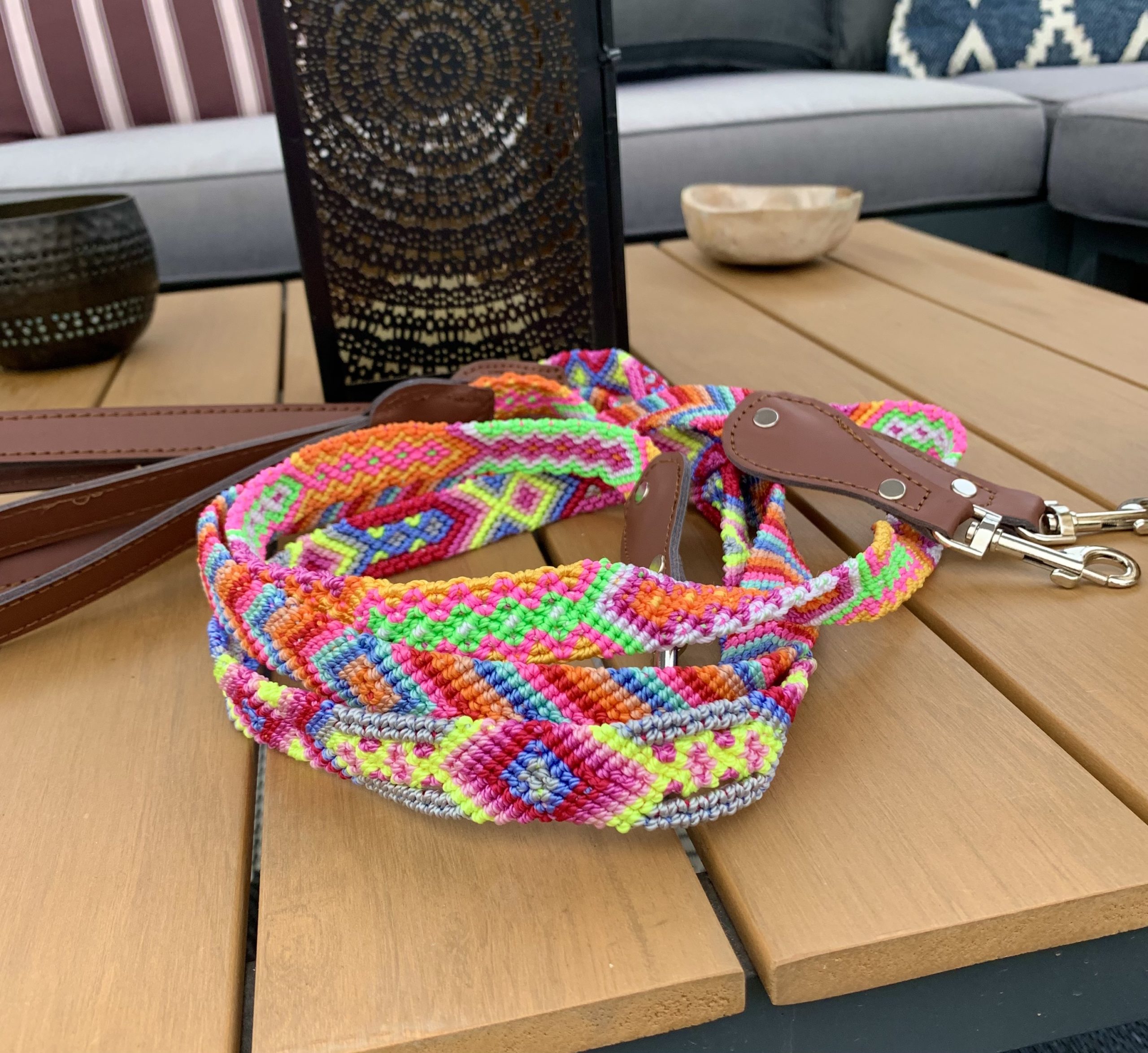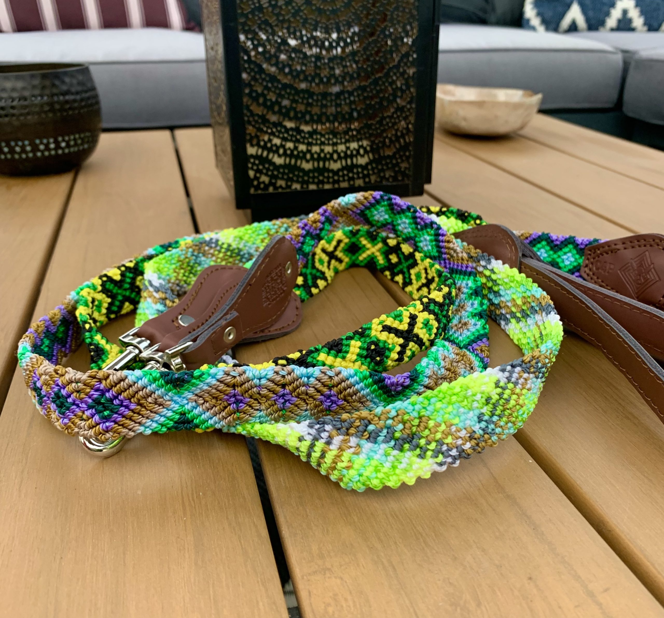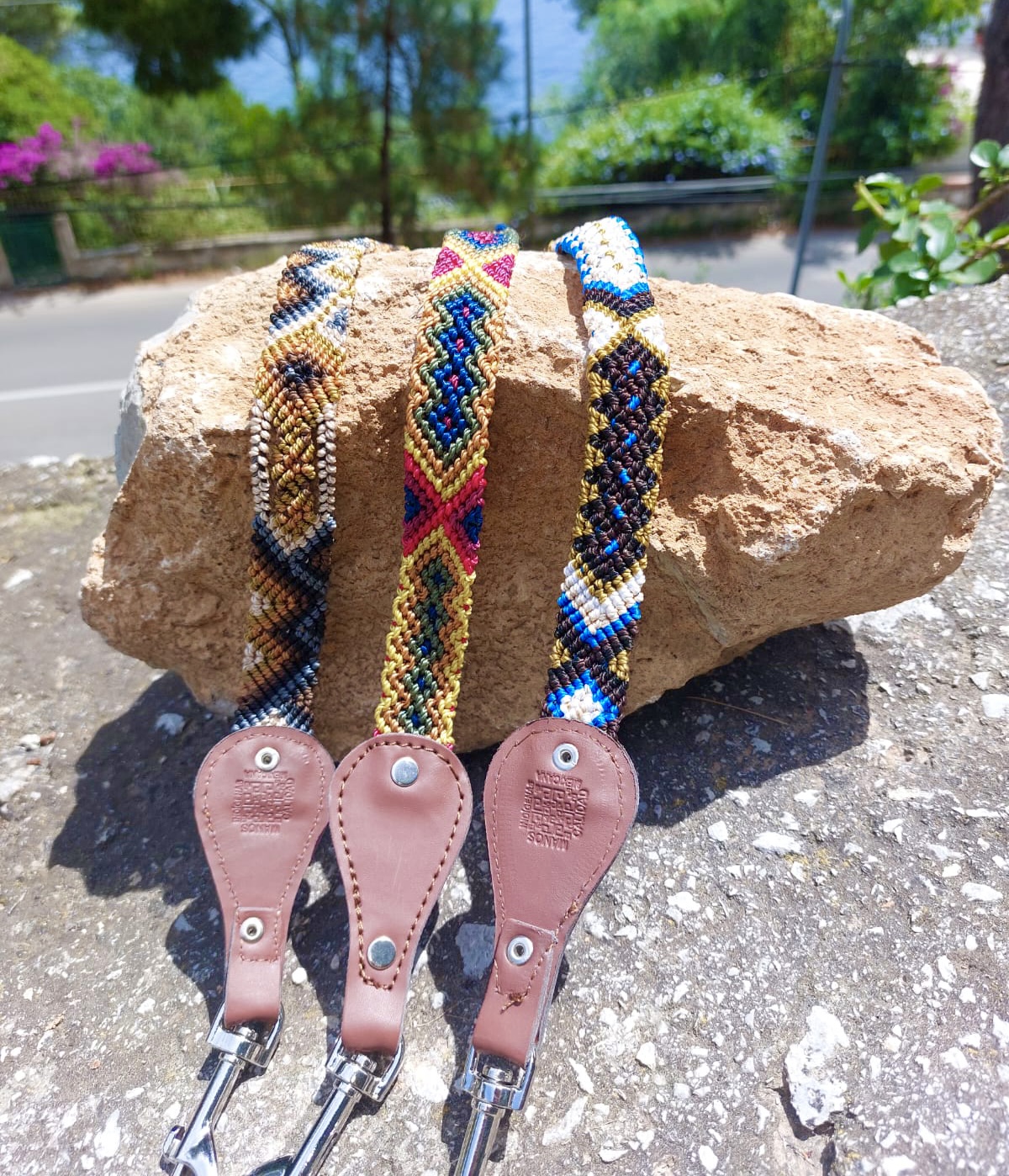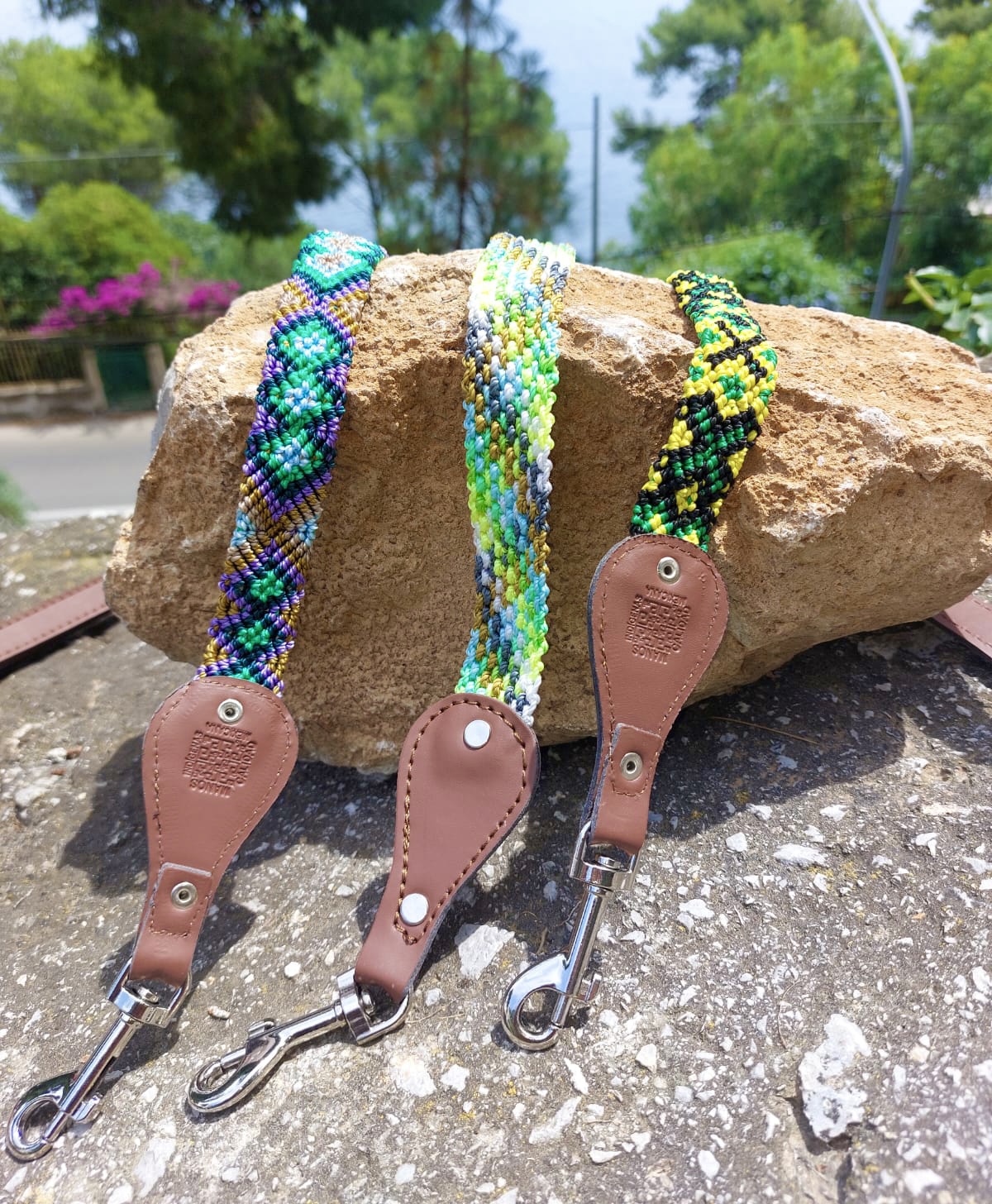 Guinzaglio C4P, fatto con 5 colori di fili di cotone intrecciati a mano da artigiani dell’altipiano del Chiapas in Messico. Ampia manopola in ecopelle, 100% Cruelty free. Lunghezza 120 cm , larghezza 2,5cm.