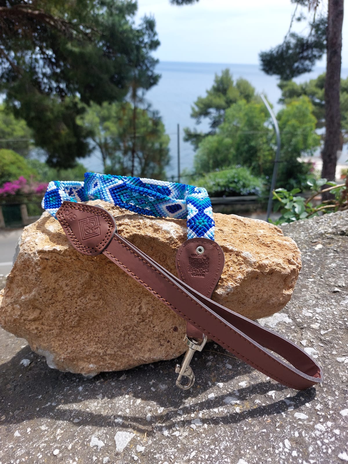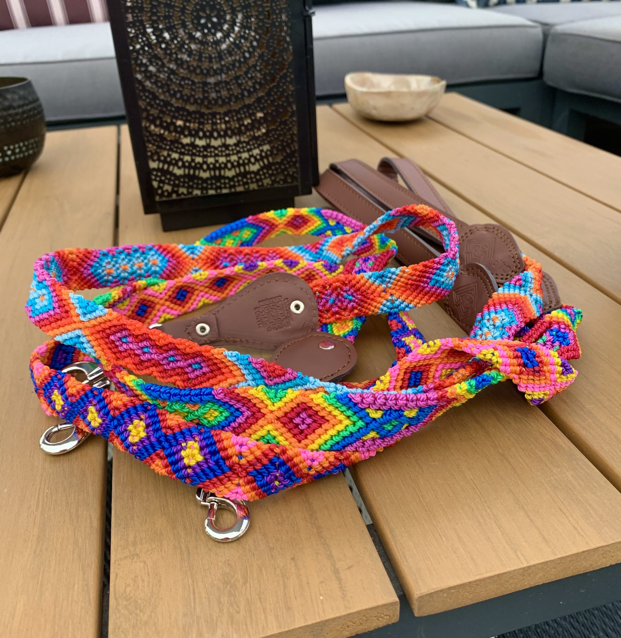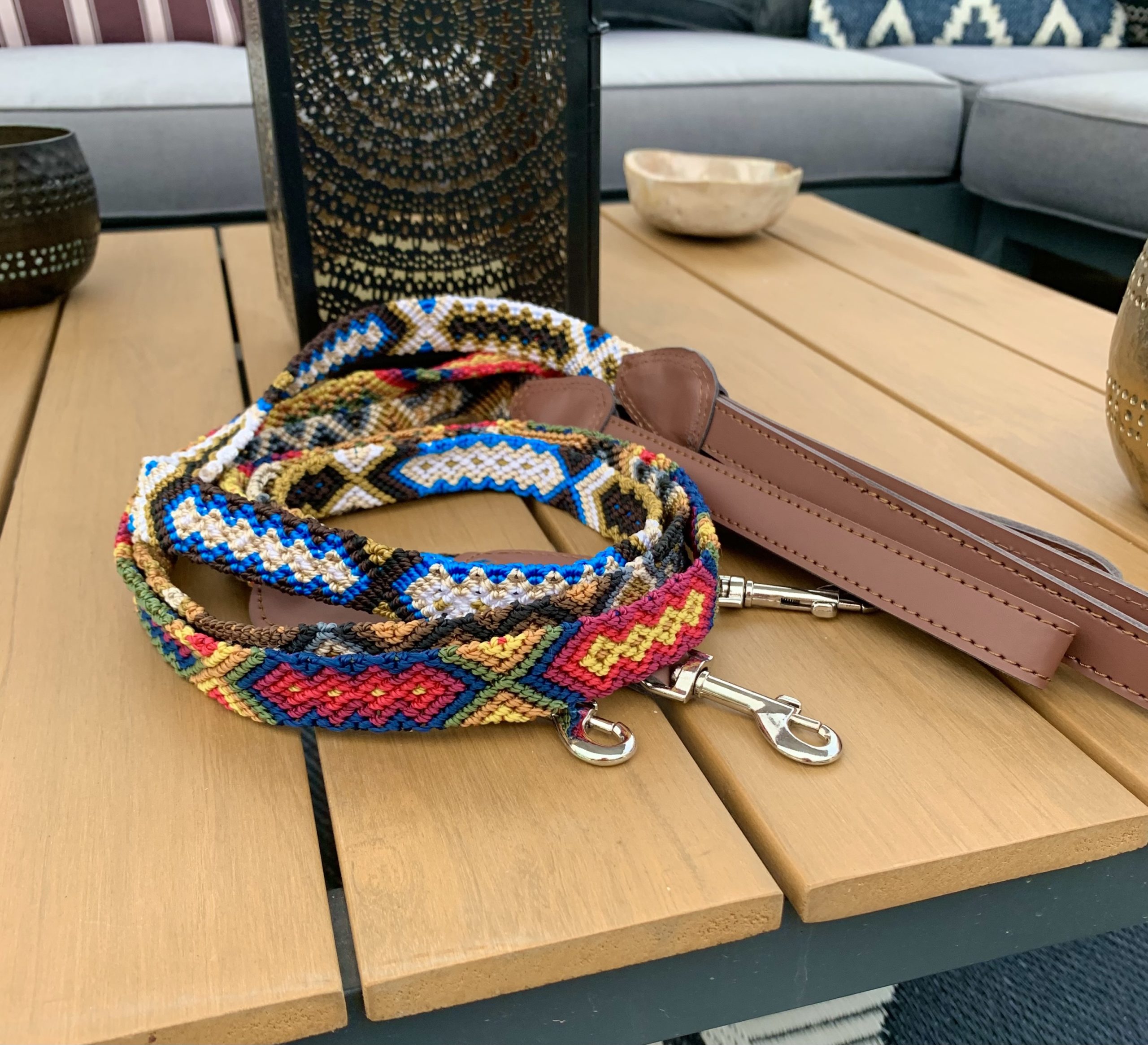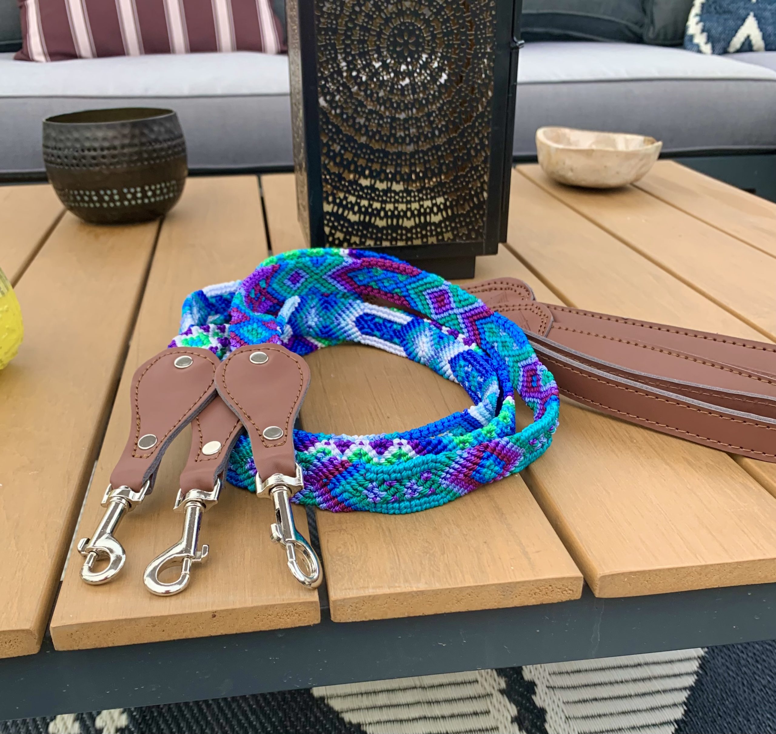 Guinzaglio C4P, fatto con 5 colori di fili di cotone intrecciati a mano da artigiani dell’altipiano del Chiapas in Messico. Ampia manopola in ecopelle, 100% Cruelty free. Lunghezza 120 cm , larghezza 2,5cm.