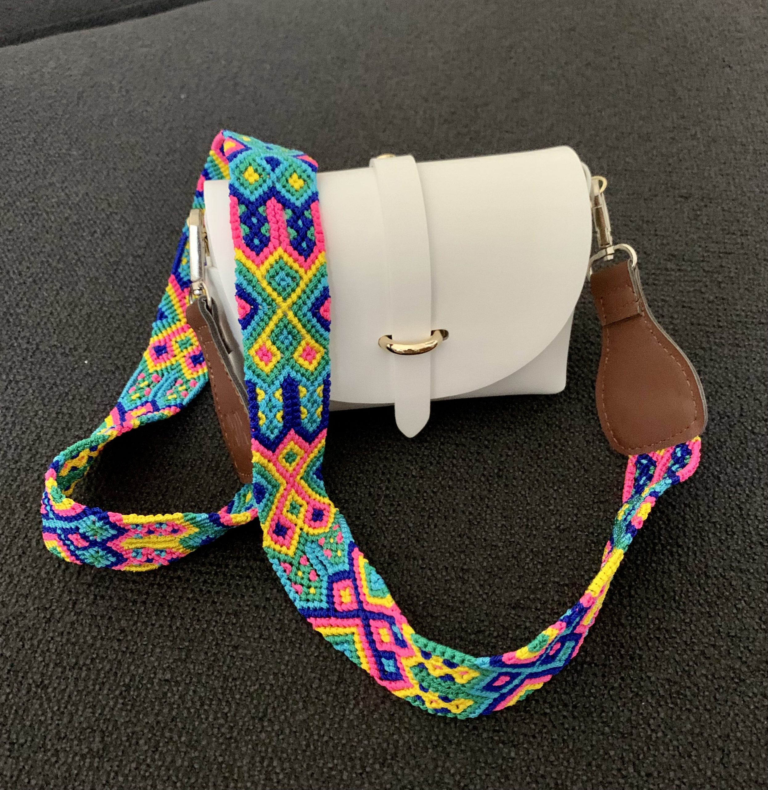 Tracolla per borsa con gancio a moschettore. 100% Cruelty Free, realizzata a mano da artigiani della regione del Chiapas in Messico. La tracolla, coordinata al collare del vostro amico a 4 zampe, si adatta a qualsiasi tipo di borsa o shopping bag.